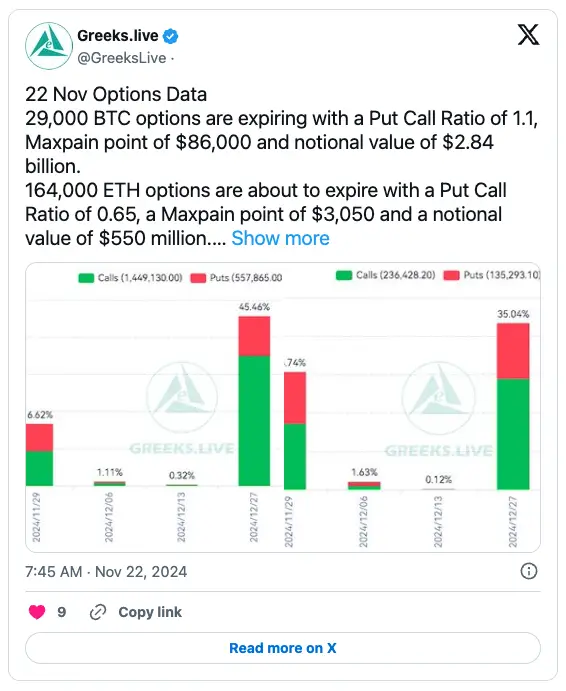 Hôm nay, ngày 22 tháng 11, thị trường tiền điện tử lại sôi động khi gần 29.000 hợp đồng Bitcoin options sẽ hết hạn, tổng giá trị lên tới khoảng 2,84 tỷ USD, trong bối cảnh Bitcoin đạt mức cao kỷ lục mới.
