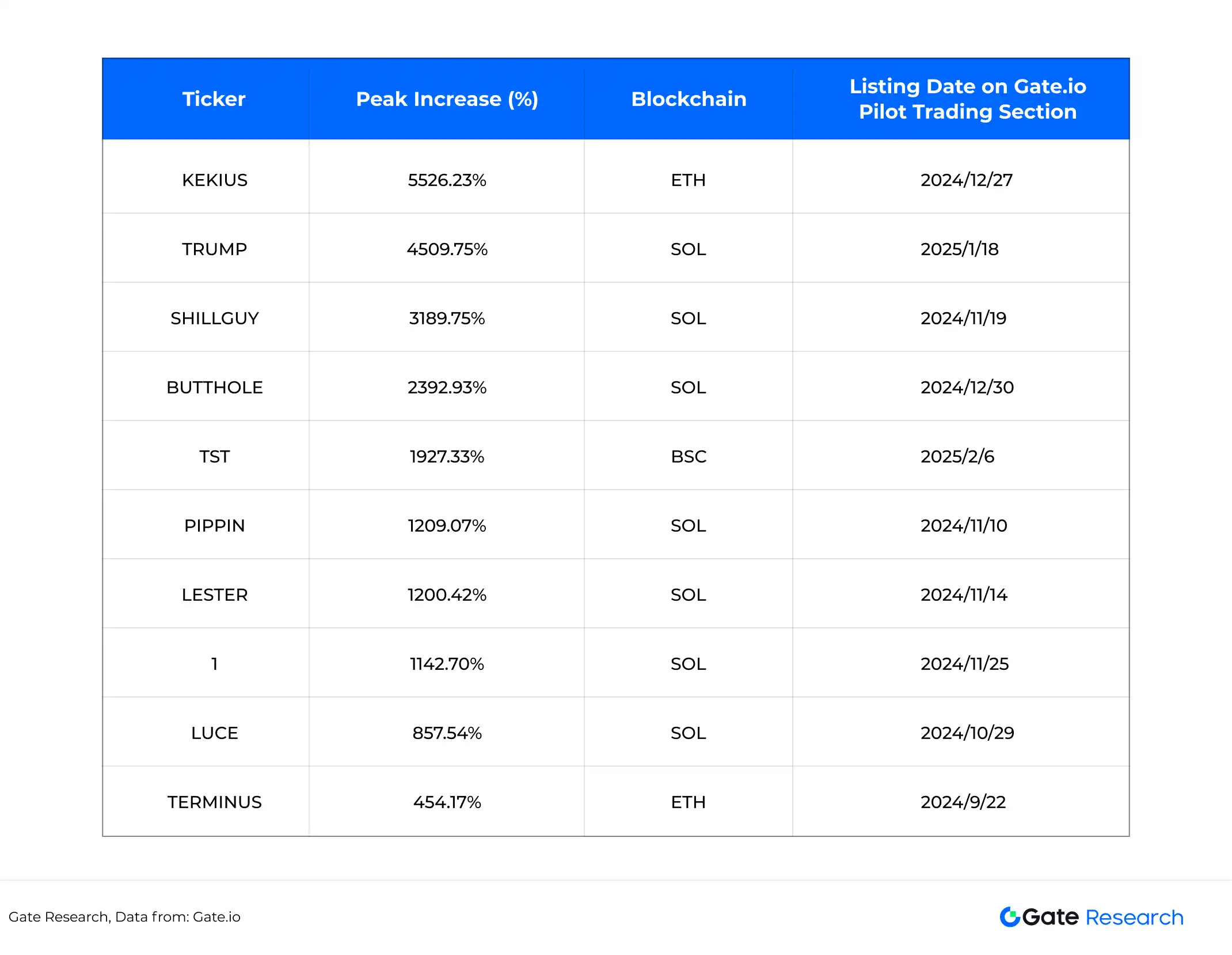 Theo báo cáo, tính đến ngày 11 tháng 2 năm 2025, Gate.io Pilot đã niêm yết 772 token dự án MEME, trong đó có 73 đã chuyển sang thị trường giao ngay thành công—một tỷ lệ chuyển đổi ấn tượng là 9.46%. Những danh mục này trải dài qua nhiều hệ sinh thái blockchain và bao gồm các đồng meme, token AI, dự án dựa trên nghệ thuật, câu chuyện chính trị, và nhiều hơn thế. Ngoại trừ các trường hợp biến động cực đoan, mức tăng cao nhất của token được ghi nhận đạt 5,526.23%, với nhiều token đạt lợi nhuận trên 100%.