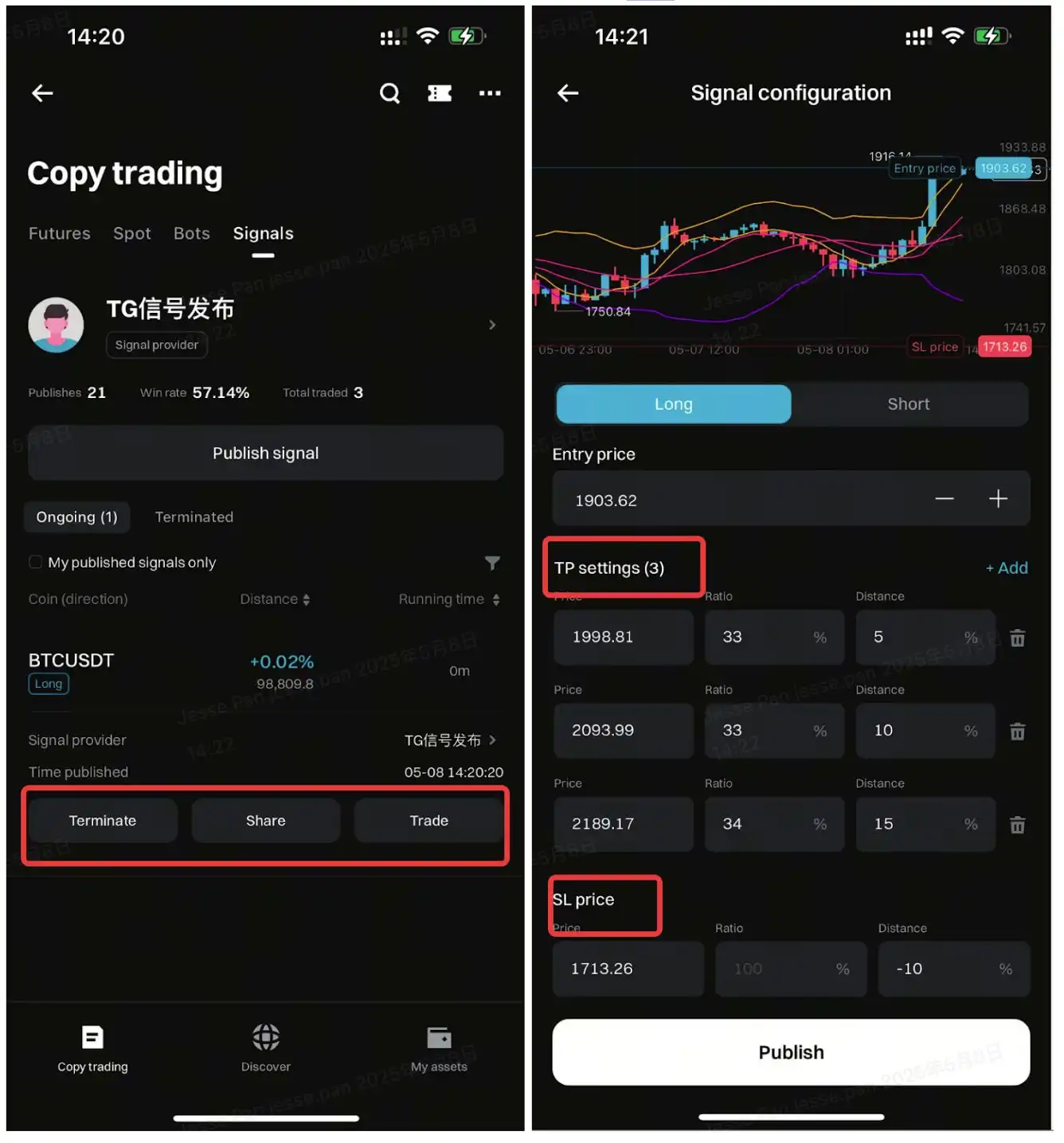 Khi đăng ký được chấp thuận, vào [Sao chép], nhấn [Tín hiệu], sau đó [Đăng tín hiệu]. Bắt đầu bằng việc chọn cặp giao dịch và hướng giao dịch. Tiếp theo, nhập giá vào lệnh mong muốn, đòn bẩy và tỷ lệ đầu tư. Bạn có thể thiết lập tối đa 5 mục tiêu chốt lời và cắt lỗ để xác định chiến lược rõ ràng. Sau khi cấu hình tín hiệu, nhấp “Đăng”. Hệ thống sẽ tự động tạo mật khẩu tín hiệu để bạn chia sẻ trong cộng đồng hoặc trên mạng xã hội.