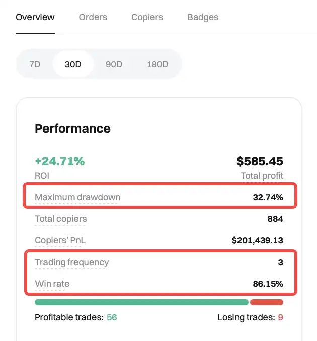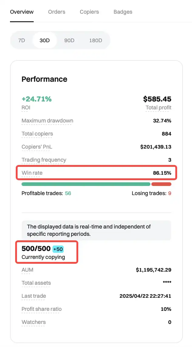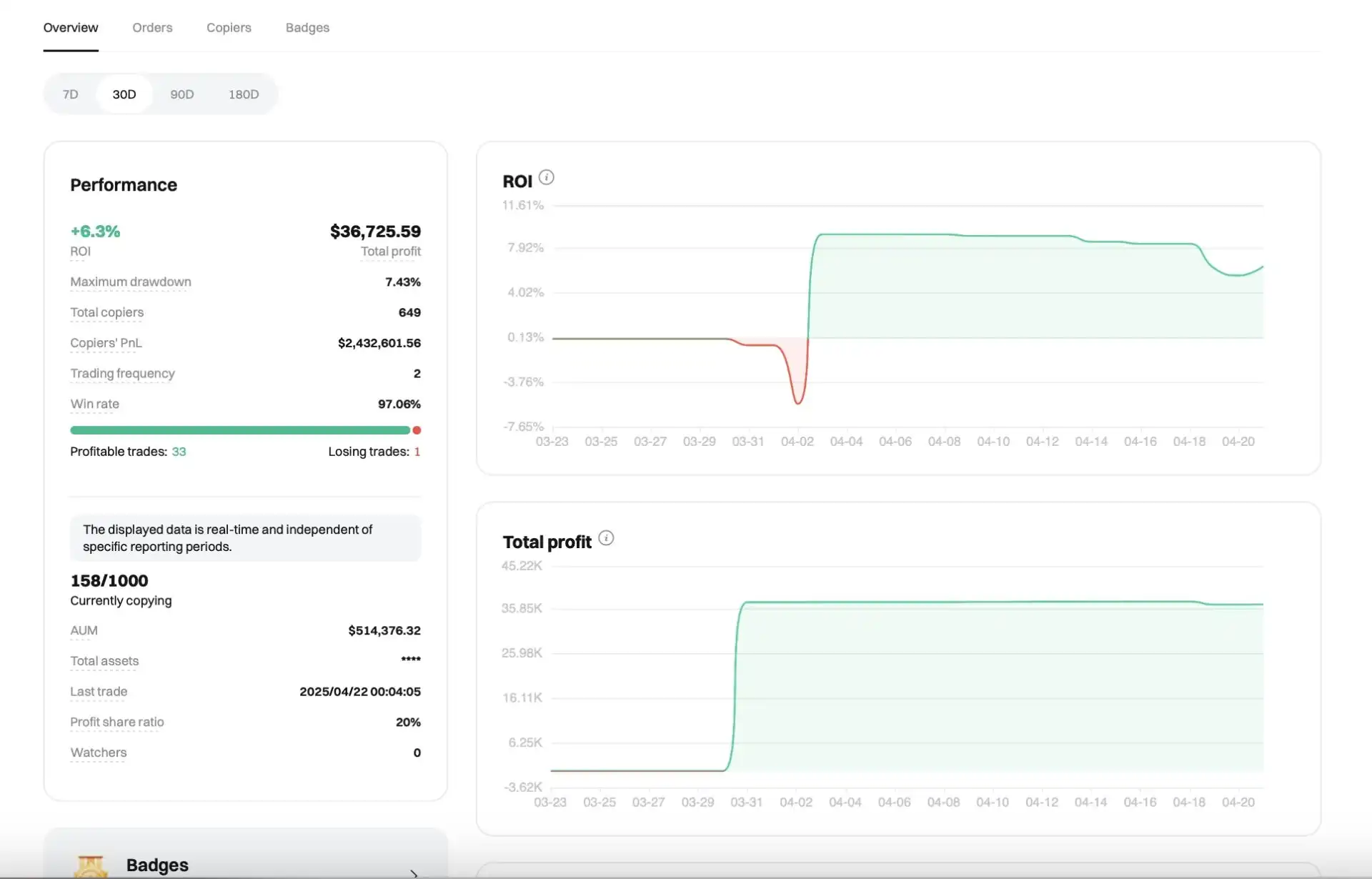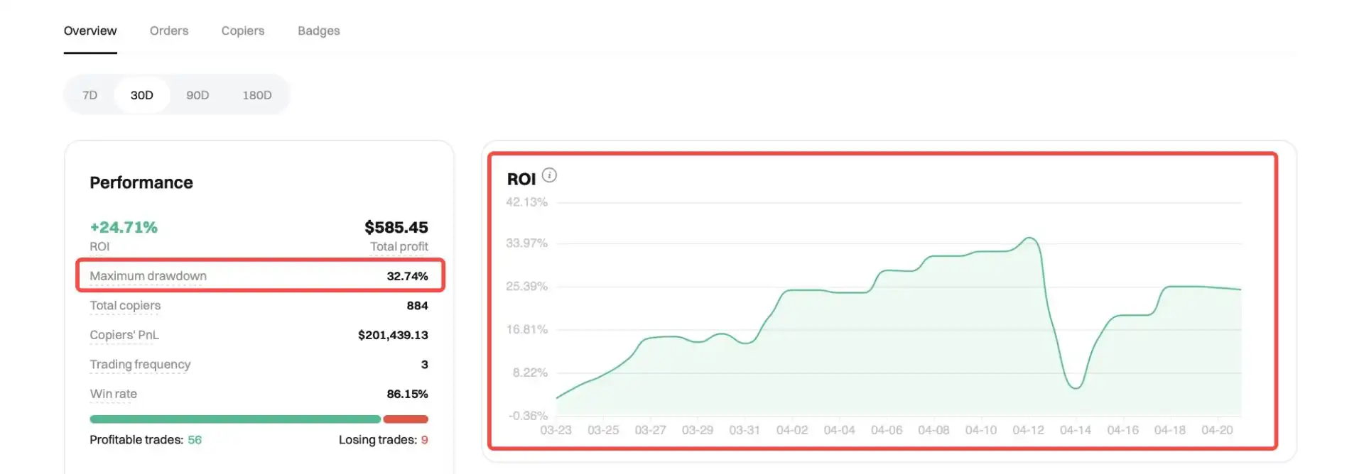 ● Một nhà giao dịch có ROI ổn định trong 90 ngày, thời gian nắm giữ trung bình từ 2-7 ngày và lợi nhuận người sao chép cao cho thấy dấu hiệu của tính kỷ luật và độ tin cậy.