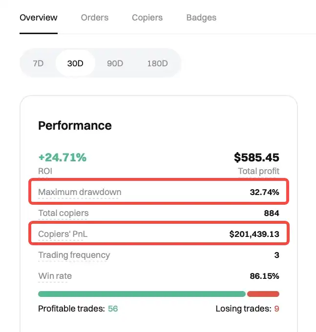 | Mức giảm + Lời/Lỗ của người sao chép | Kiểm soát rủi ro + Kết quả thực tế | Xác nhận rằng các elite trader có rủi ro thấp cũng mang lại lợi nhuận thực sự |
