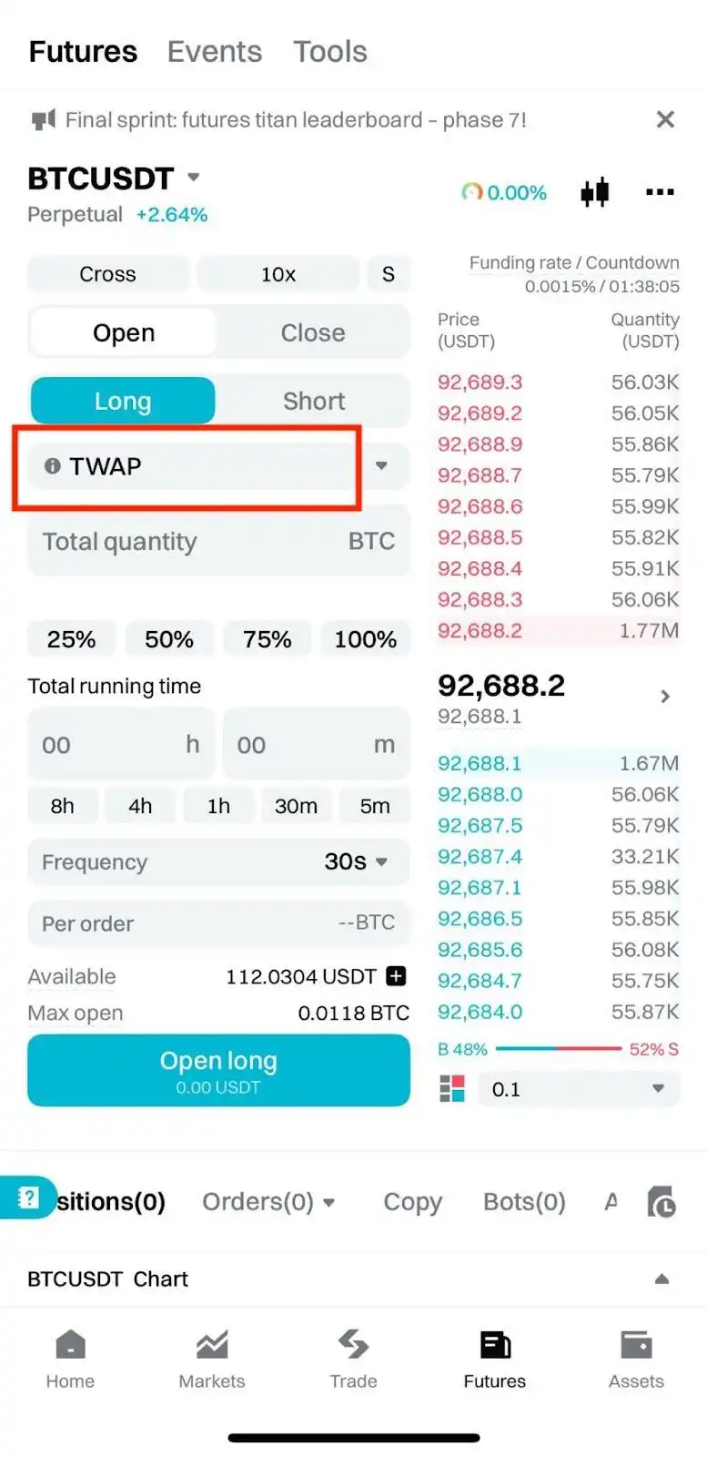Bitget giúp bạn dễ dàng sử dụng TWAP để giao dịch futures. Bạn có thể thiết lập trên ứng dụng di động hoặc trên website.