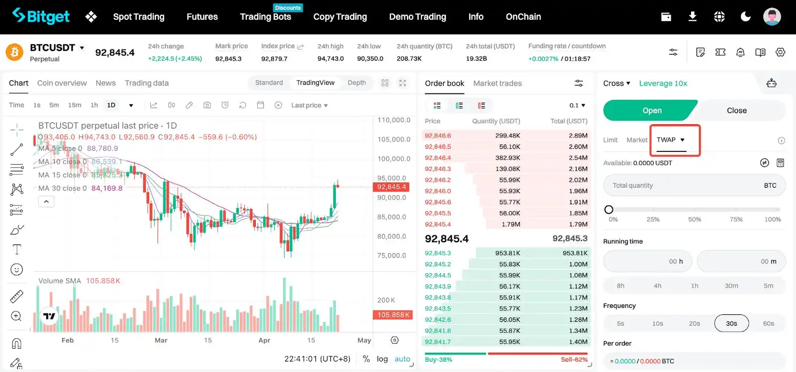 TWAP đặc biệt hữu ích trong giao dịch futures, nơi mọi mức giá đều có giá trị. Và Bitget, một nền tảng futures tiền điện tử hàng đầu, cung cấp tính năng TWAP tích hợp dễ sử dụng cho cả người mới và nhà giao dịch chuyên nghiệp.