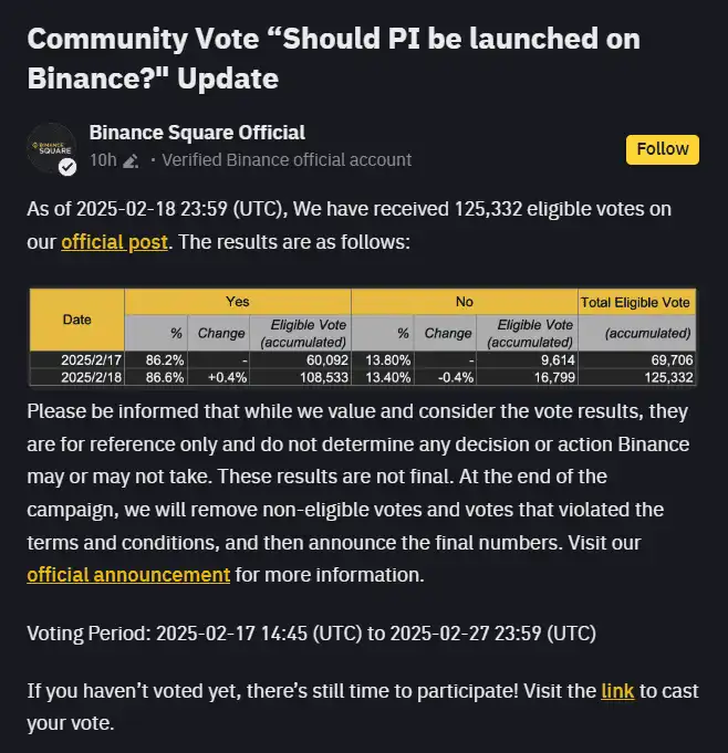 Binance đã tổ chức một cuộc bỏ phiếu cộng đồng về việc niêm yết Pi nhưng sau đó khẳng định kết quả bỏ phiếu sẽ không ảnh hưởng đến quyết định cuối cùng.
