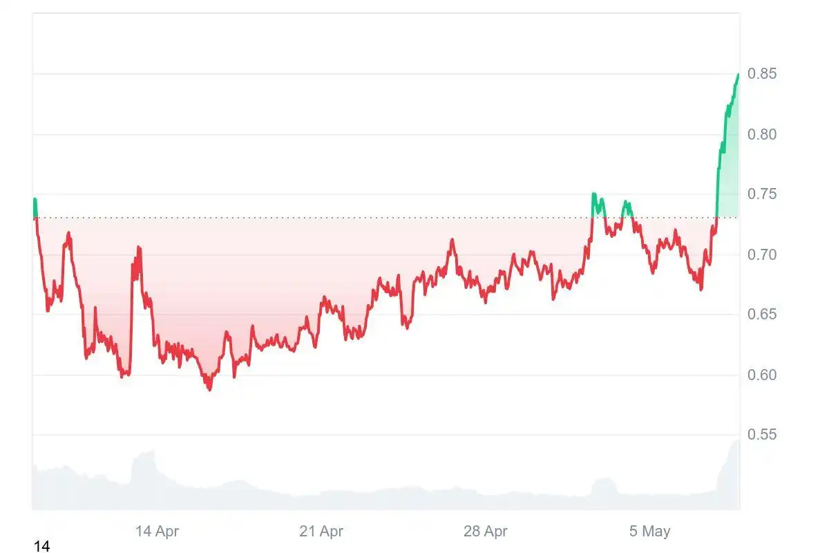 Sự kiện đổi tên đã ngay lập tức gây tiếng vang trên thị trường. Từ mức giá khoảng 0.43 USD đầu tháng 4, EOS đã tăng lên 0.84 USD vào ngày 08/05/2025. Đây là mức tăng gần 100% chỉ trong vài tuần – một tín hiệu cho thấy niềm tin thị trường đang quay trở lại.